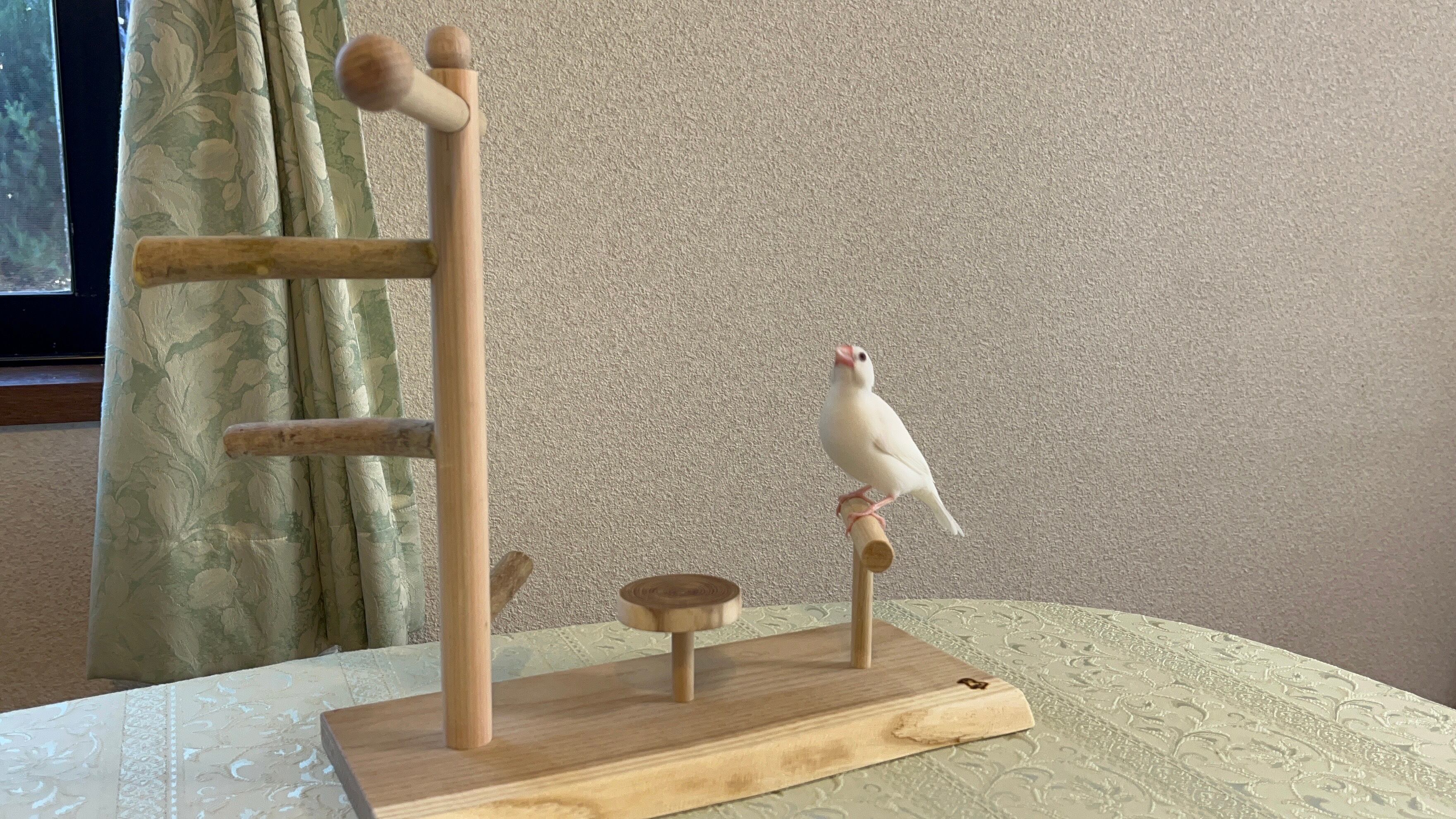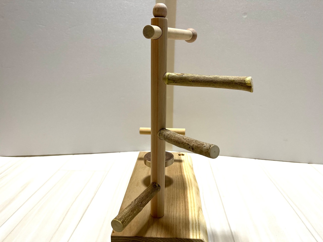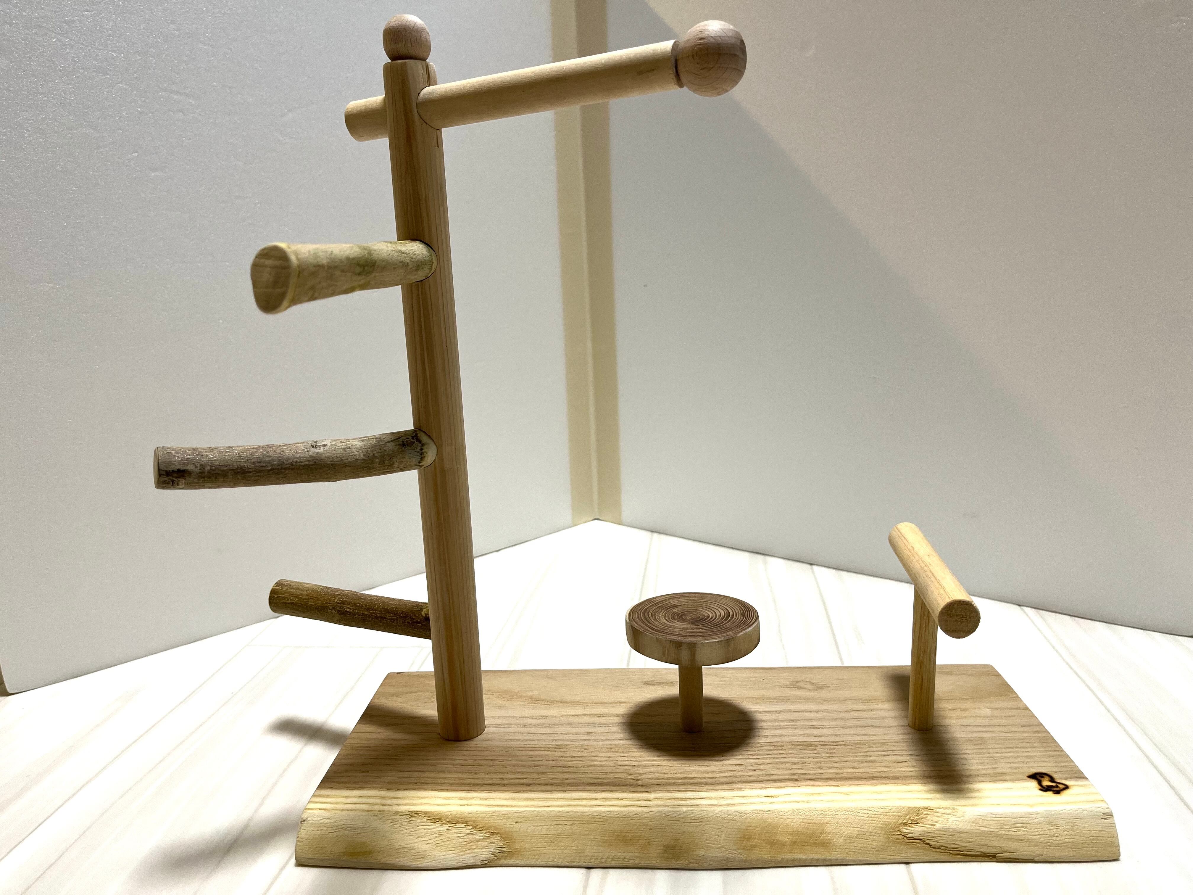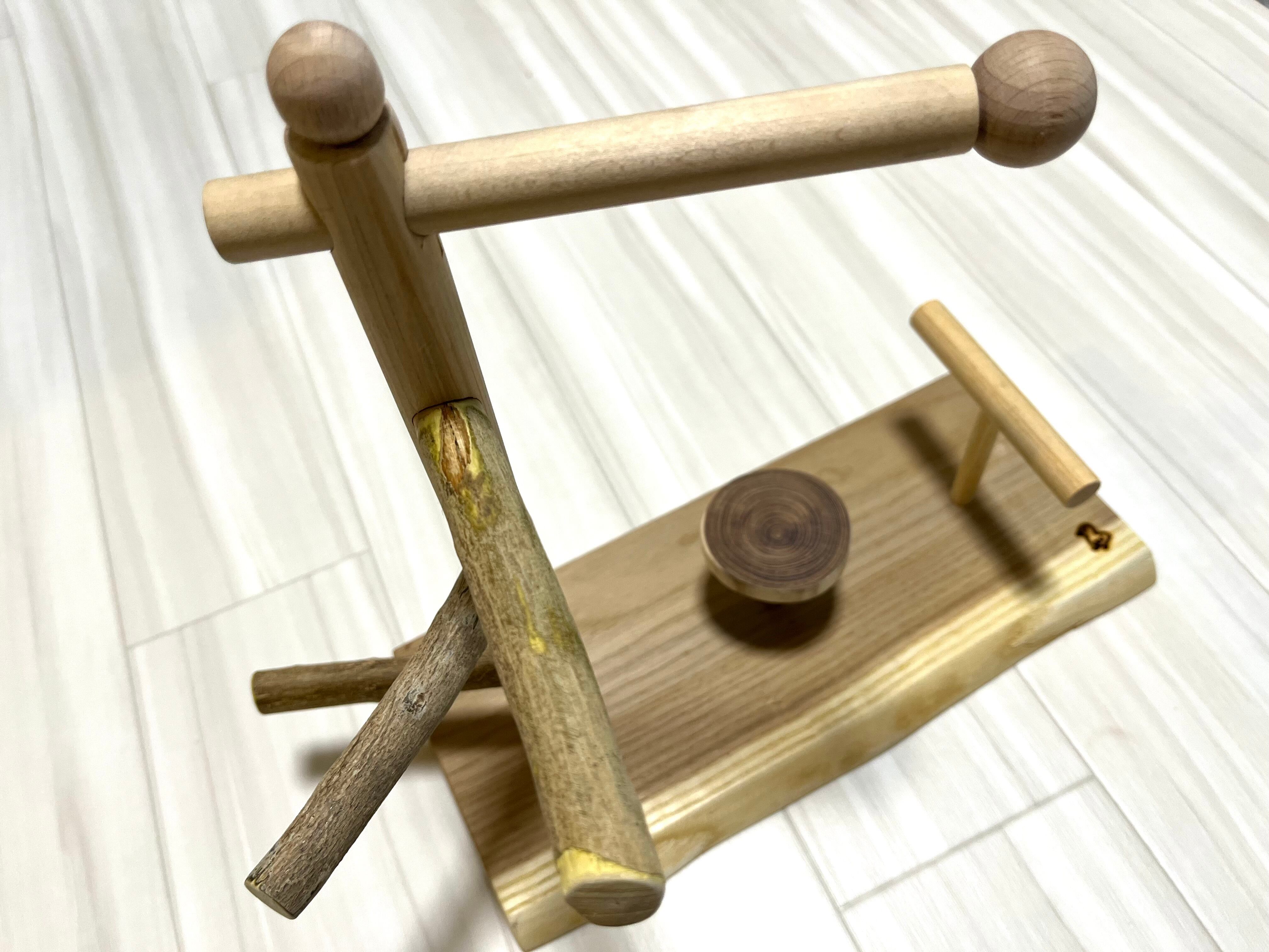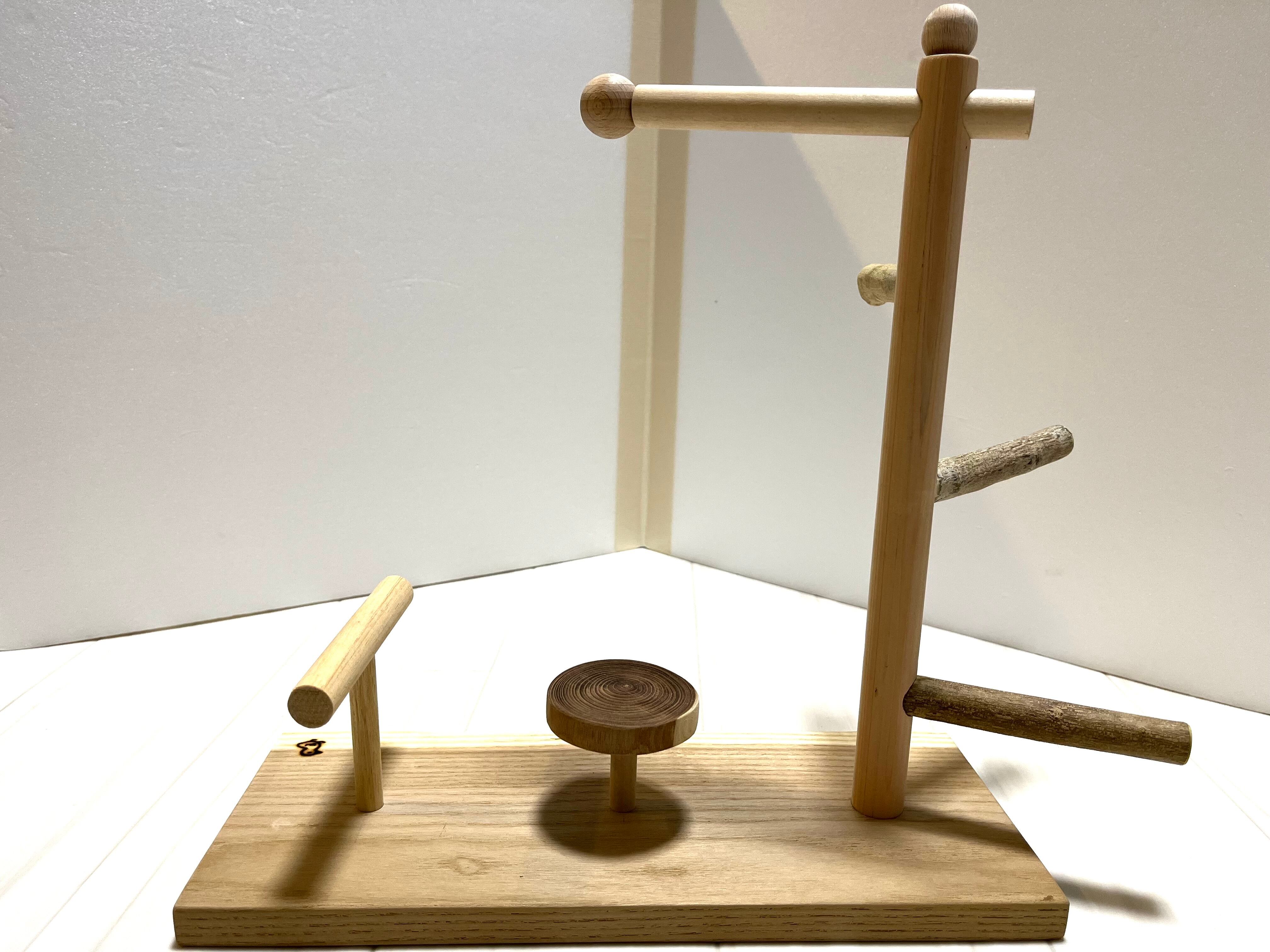 止まり木部分の三本は加工された丸棒ではなく自然のままの木の枝(煮沸洗浄済)を使用している、製作者"まさじぃ"こだわりの作品です。